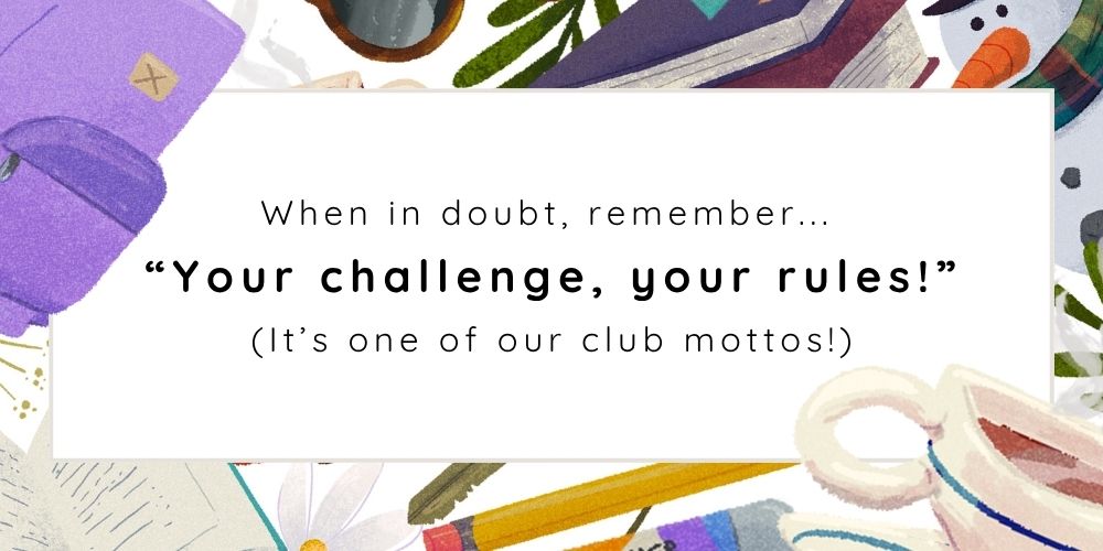 - Keep in mind that everyone completes the challenges differently. You may be super strict with your interpretation of the prompts OR you may enjoy getting creative and thinking outside the box. How you choose to complete this challenge is ultimately up to you. YOUR CHALLENGE, YOUR RULES!
